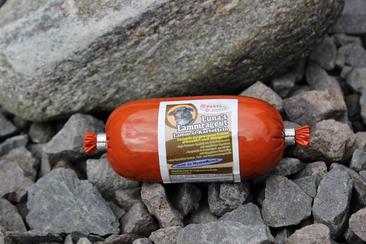 Dieses Gericht ist für alle ausgewachsenen Hunde als Alleinnahrung geeignet. Auch Ihr Welpe im Alter ab 3 Monate darf die PANYS-Wurst auf 4-5 Mahlzeiten verteilt bekommen. Da Welpen während des Wachstums einen höheren Bedarf an Kohlenhydraten haben, sollten Sie auf alle Fälle noch Welpentrockenfutter zufüttern. Hergestellt werden die PANYS Würste in Deutschland nach Lebensmittelstandard, ohne zugesetzte Aroma- und Farbstoffe. Wir wünschen Ihrem Liebling guten Appetit!