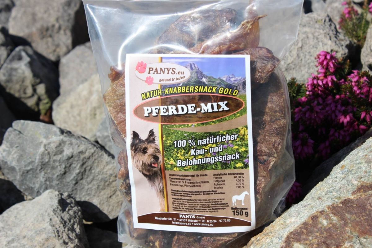 Unsere getrockneten Kauartikel stammen von kontrollierten Schlachthöfen und alle Rohstoffe stammen von Tieren, die amtlich zum menschlichen Verzehr zugelassen sind. Modernste Trocknungsanlagen gewährleisten höchste Qualität. Die frische Ware wird bei 60 - 80 ° zwischen 5 und 7 Tagen getrocknet. PANYS Pferde-Mix gibt es im 150 g Beutel.